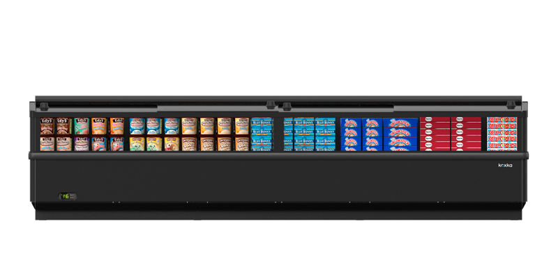 - Puertas con triple vidrio y cierre automático en la parte superior e isla abierta para congelado en la parte inferior